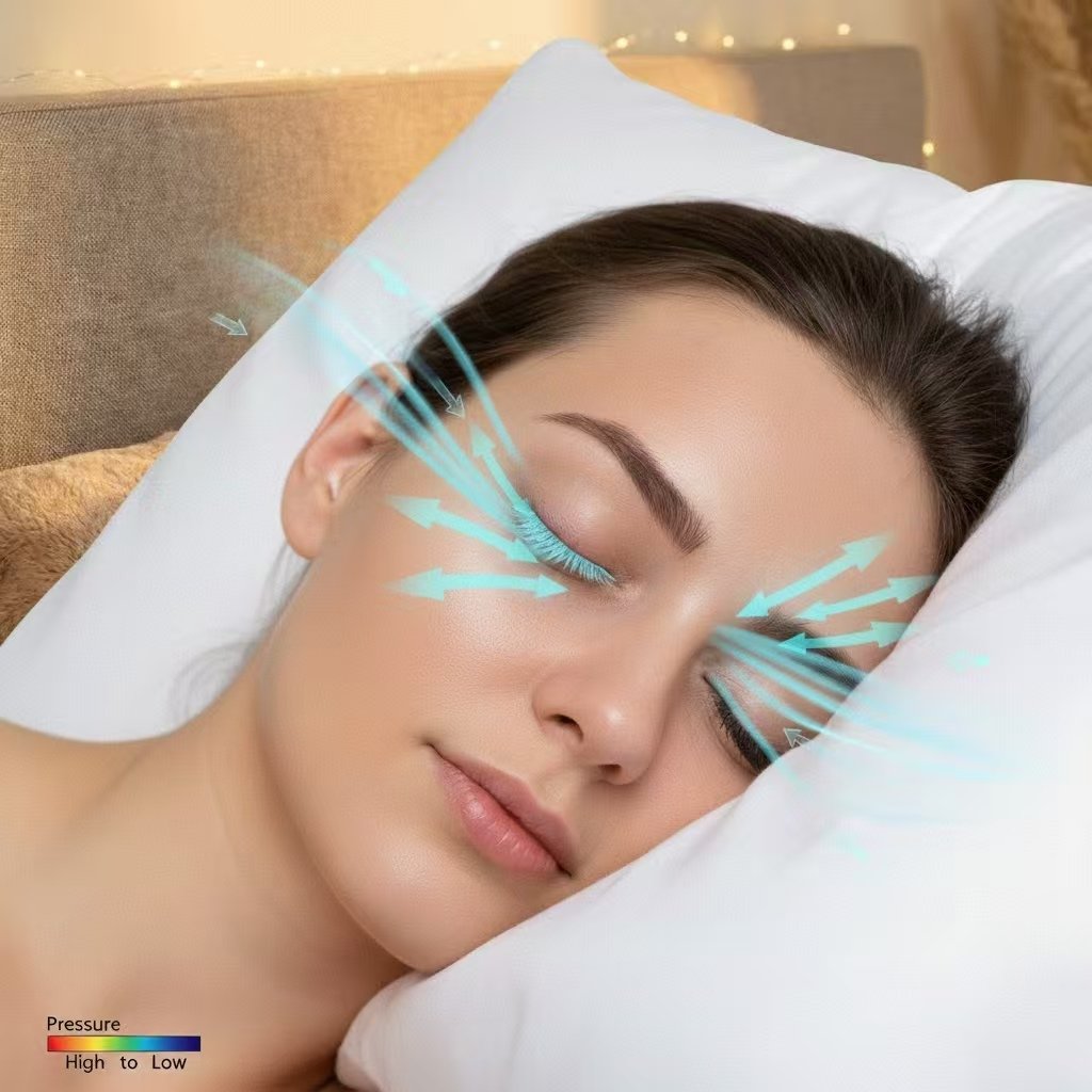 - The 4-Corner Solution: By using a strategic 4-corner support structure, the pillow creates a “suspension zone” for the face. When a client sleeps on their side, the weight is distributed across the raised corners, leaving a hollow gap where the eyes reside.